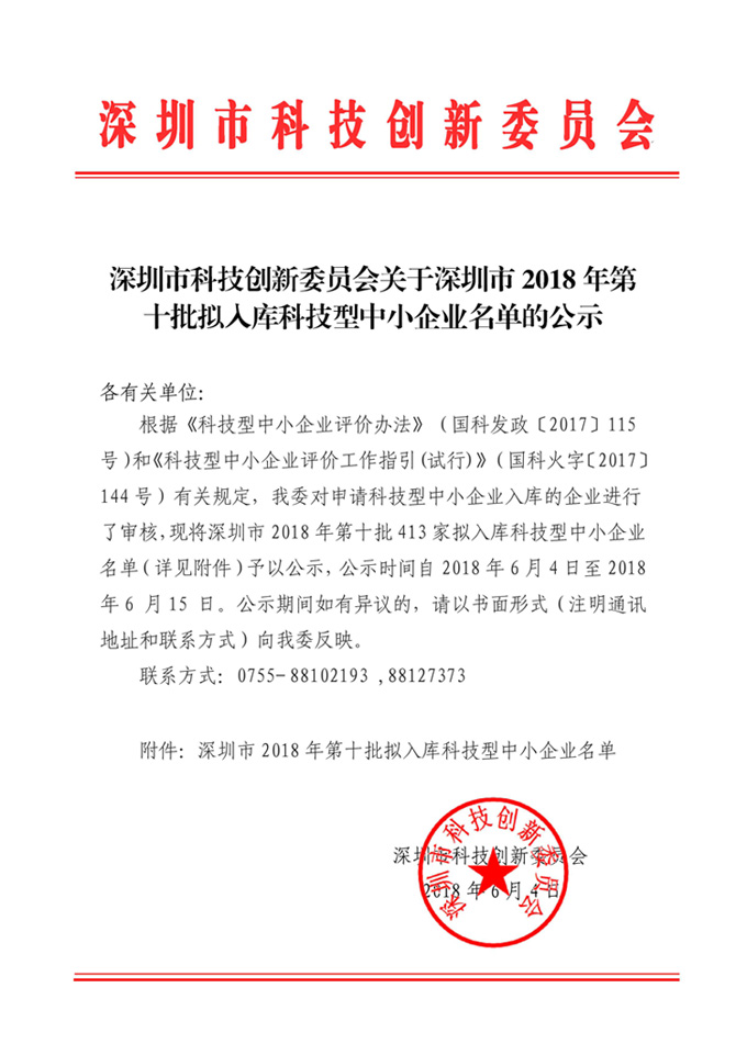 При единодушном одобрении компетентных органов провинциального правительства провинции Гуандун, Шэньчжэньского комитета по науке и технике и Шэньчжэньского районного бюро науки и техники Футянь успешно классифицируется как « предприятие с инновационными технологиями». Список можно найти в приложении:showFiles.pdf